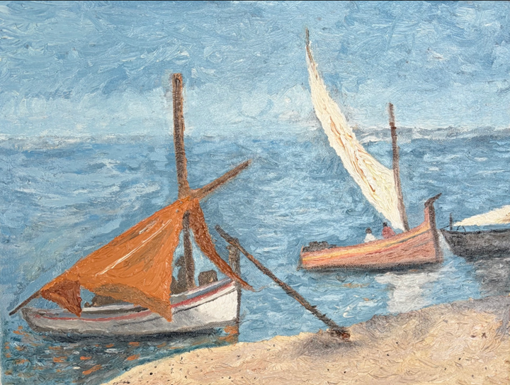 Nesta obra, dois barcos ocupam a cena em momentos distintos de travessia. Em primeiro plano, uma embarcação ancorada repousa junto à areia, sua vela laranja caída como um gesto de pausa. Ao fundo, outro barco segue em movimento, captando o vento com sua vela clara e elevada.