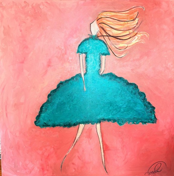 Vestido Azul apresenta uma figura feminina vista de costas, construída por linhas delicadas e volumes amplos. O corpo quase se dissolve no movimento do vestido, que ocupa grande parte da composição e se transforma em campo cromático e matéria pictórica.